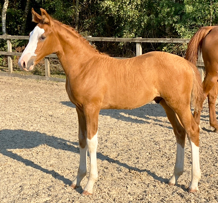 By the Chesnut stallion Billy Um Bongo. Billy Um Bongo is by The Billy Stud?s homebred international show jumper Billy Congo now proving himself to be a producer of top class competition horses. Billy Congo's sire is Vechta, the AES and Irish Horse Board approved stallion, a talented show jumper and consistent winner at International and Grand Prix level. In 2011 he was consistently placed at International Grand Prix level. Billy Congo achieved Gold British Show Jumping Elite stallion status in 2010 and was a regular selection for the British Nations Cup Team ridden by William Funnell. He was part of the Nations Cup winning team at Hickstead, jumping a double clear round and was selected for the British Team squad for Dublin. In 2010 he also won the International Bunn Leisure Tankard at Hickstead and was 2nd in the Derby Trial. The dam of Billy Um Bongo is Oranka Van Het Berkenhof, her sire is Feinschnitt and her dam is Dorien by G Ramiro Z. She competed successfully under the show name Orange Juice with Peter Charles winning 200k in her show jumping career and was the winner of several Grand Prix. In 2011 Billy Um Bongo in his first year of competition was the joint winner of the 4 Year Old Show Jumping Championships at Addington alongside Billy Dinero, the Billy Stud's young stallion by Cevin Z.